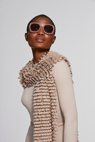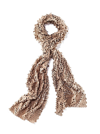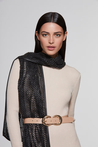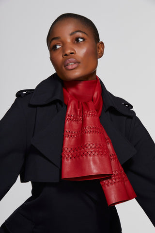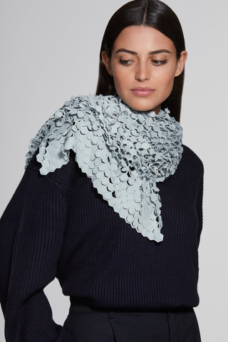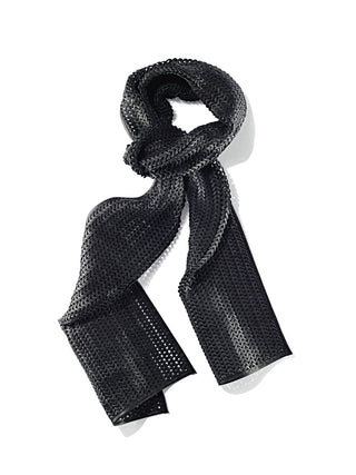 Where traditional wool scarves have had functionality as their raison d’etre, Fameed Khalique’s leather creations are pure expressions of design, innovation and creativity. Sculptural, handcrafted geometric patterns are cut into butter-soft leather and suede to create gender-fluid, amorphous luxury accessories that feel sumptuous and comforting to wear. From micro-perforations to honeycomb patterns via intricate chainmail-like leather weaves, Fameed Khalique scarves are the juncture whereupon art and fashion merge. Borne from the haute couture tradition, they become the lavish and tactile complement to any outfit. The silky soft leather and buttery suede offer a textural contrast to other natural fibres such as wool and cashmere. As the leather and suede ages, it takes on new shapes and patinas too, constantly evolving with wear, meaning no two scarves are ever the same.